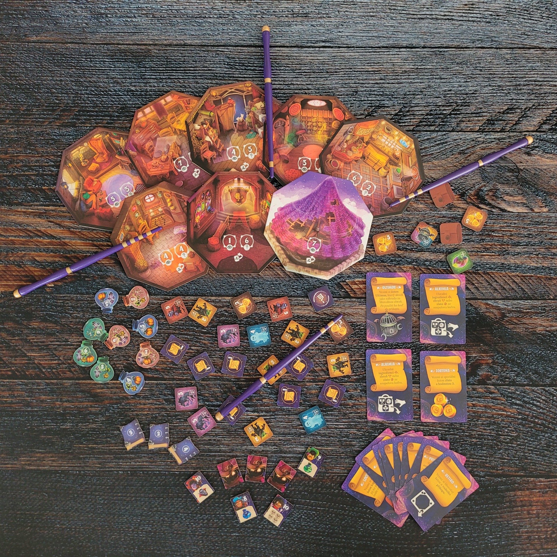kartonové žetony (viditelné, skryté a speciální žetony, žetony kouzelných knih, lektvarů a žetony čarodějů)