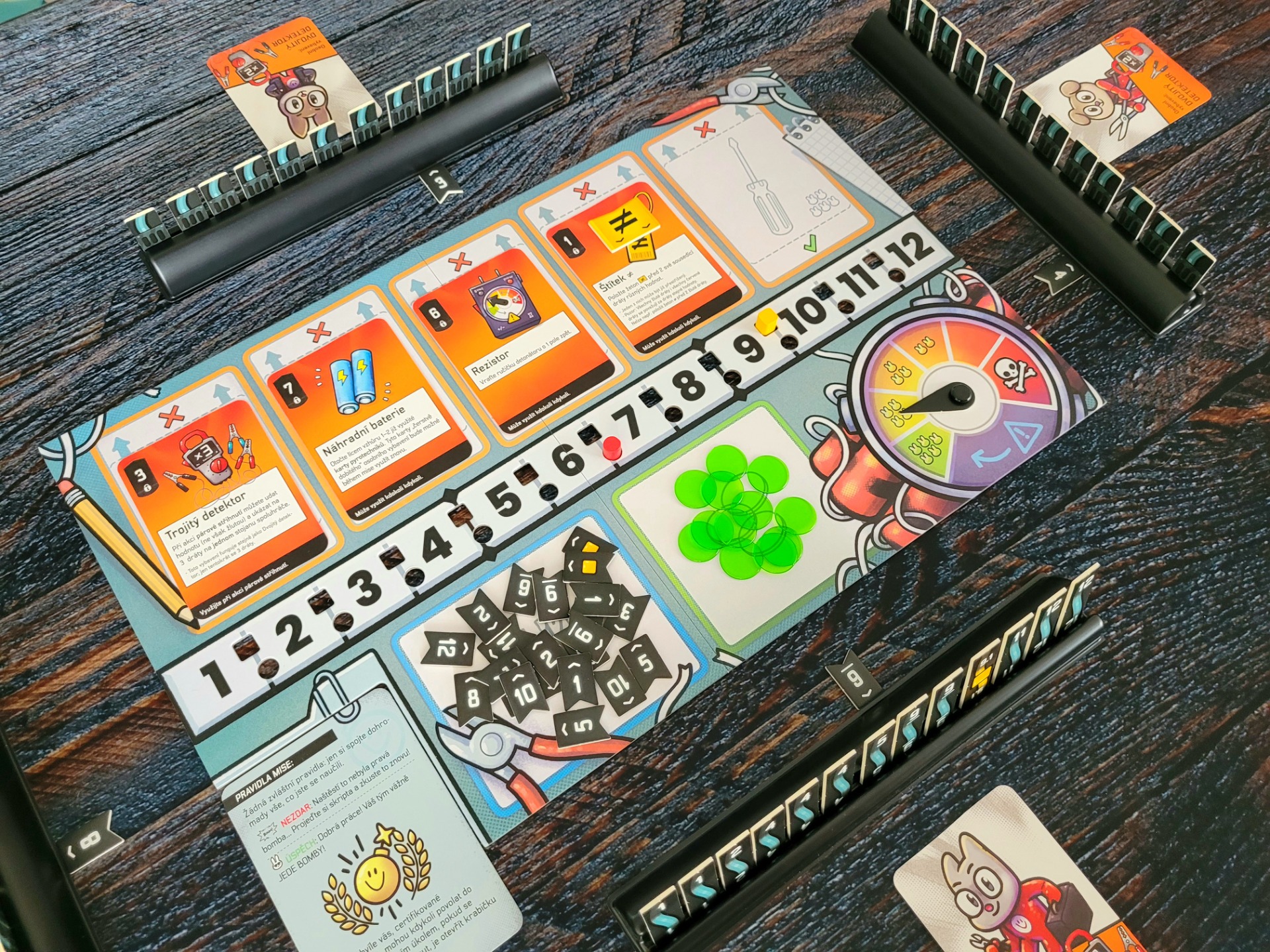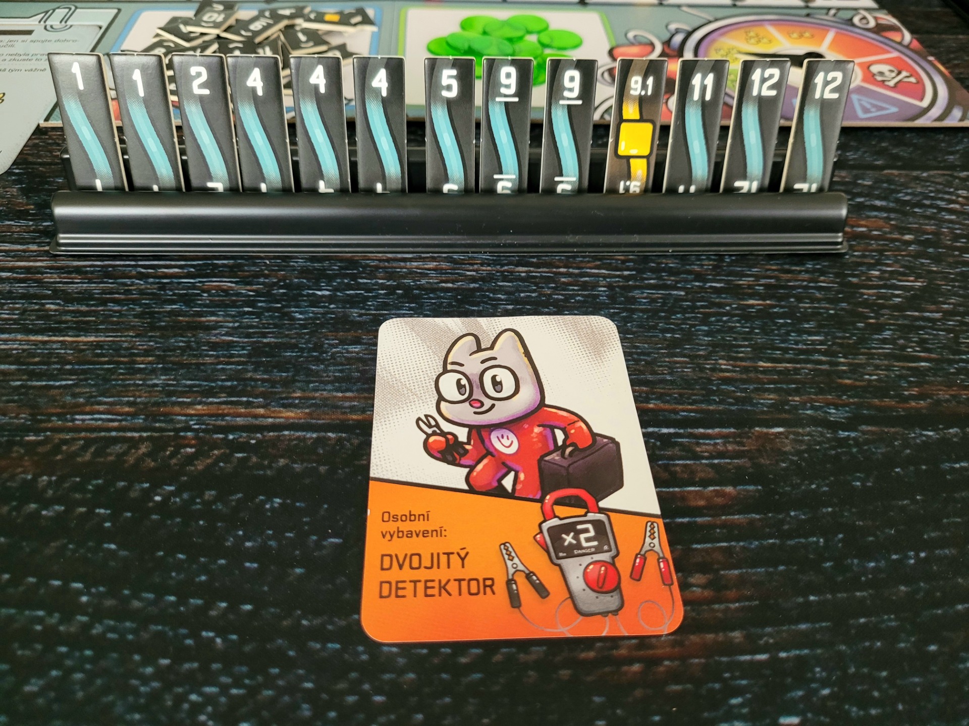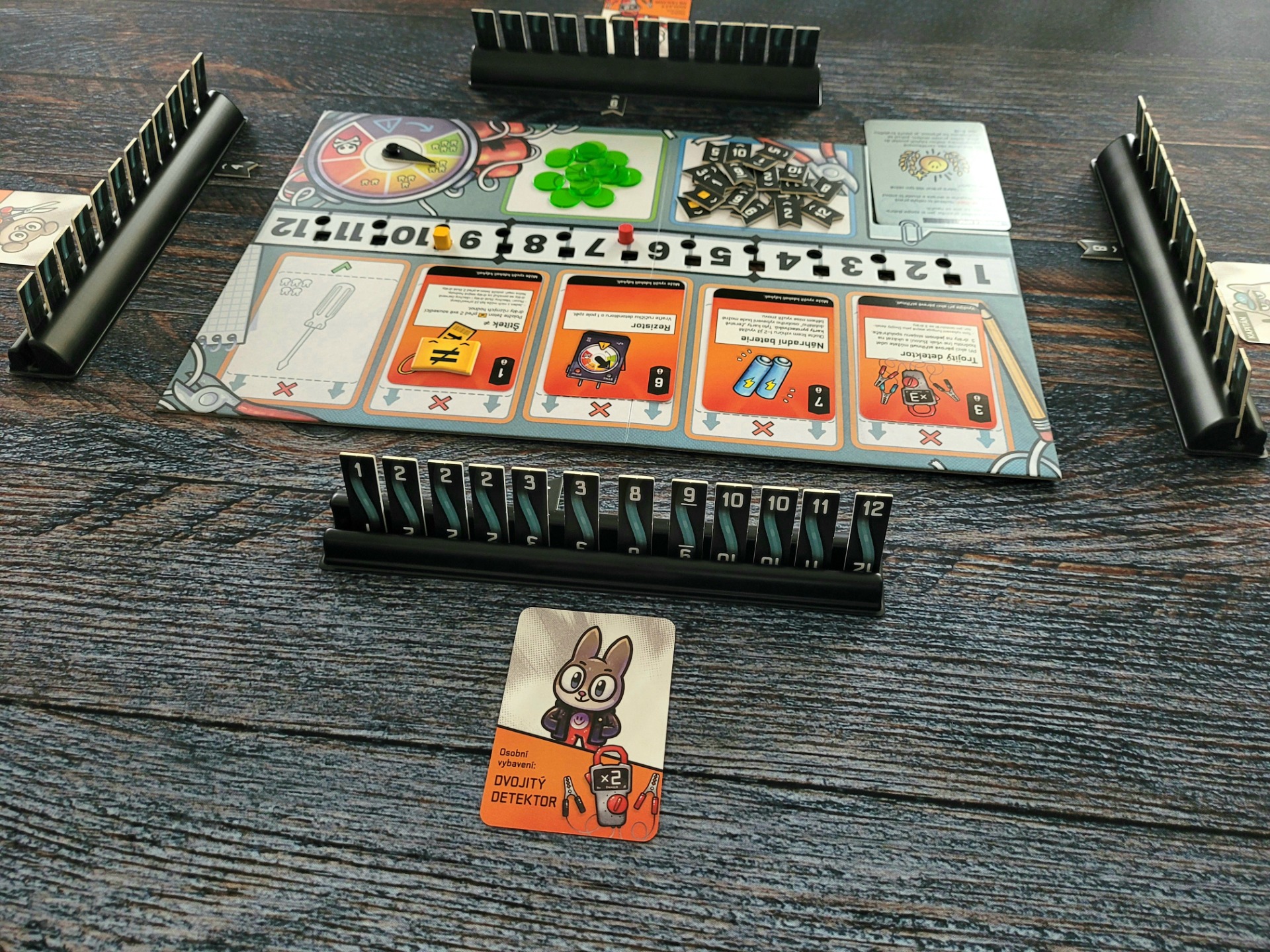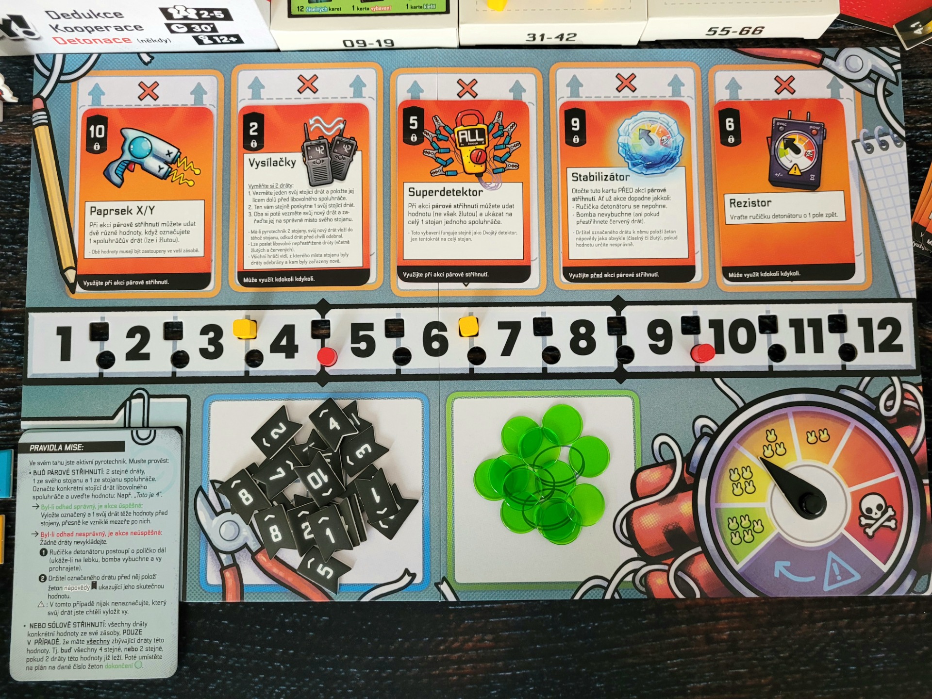 Na dolní šedá políčka vedle karty mise se umístí žetony nápověd a zelené žetony dokončení. Ručička detonátoru je natočena na políčko s tolika hlavami, kolik hraje hráčů.