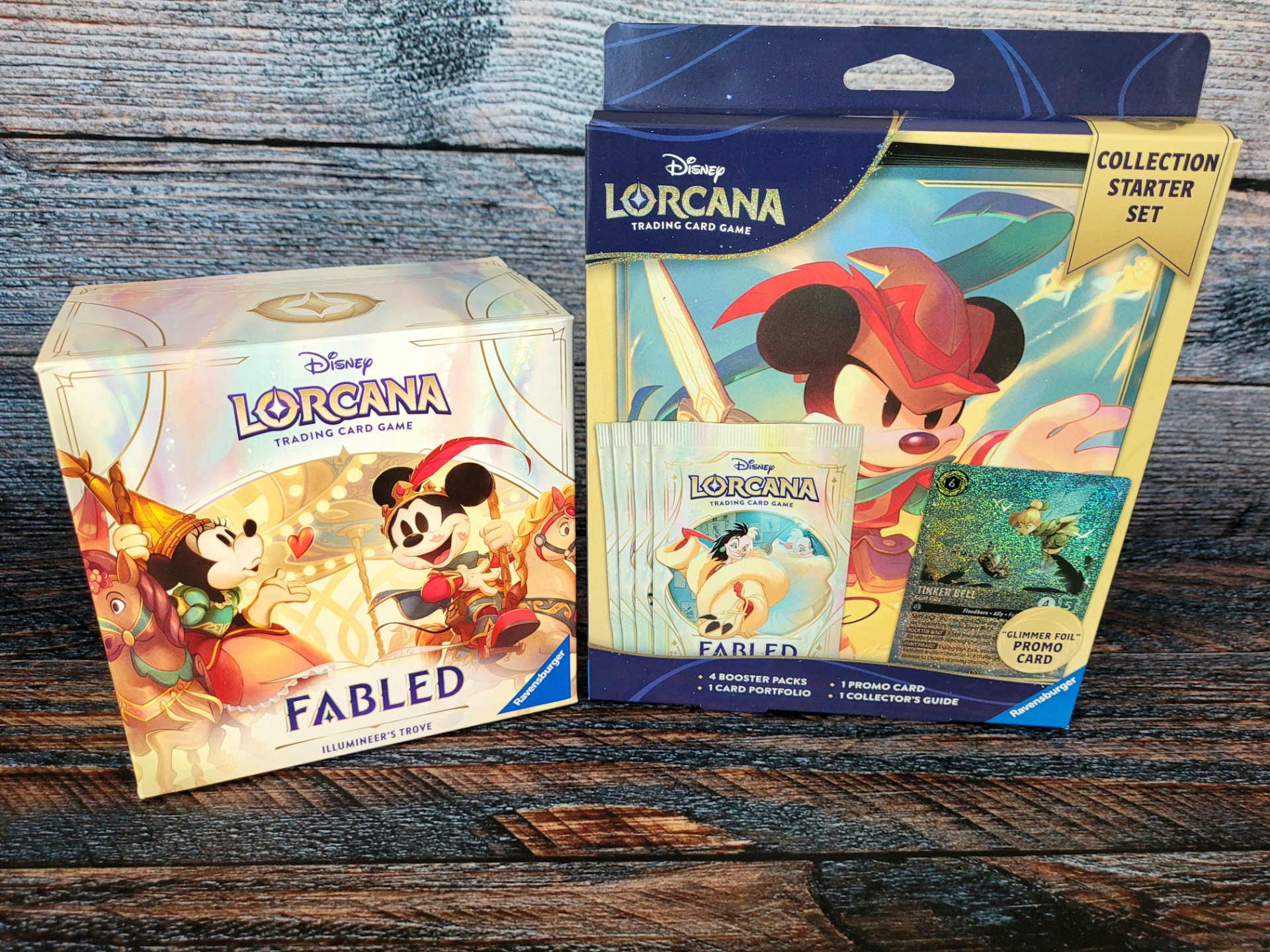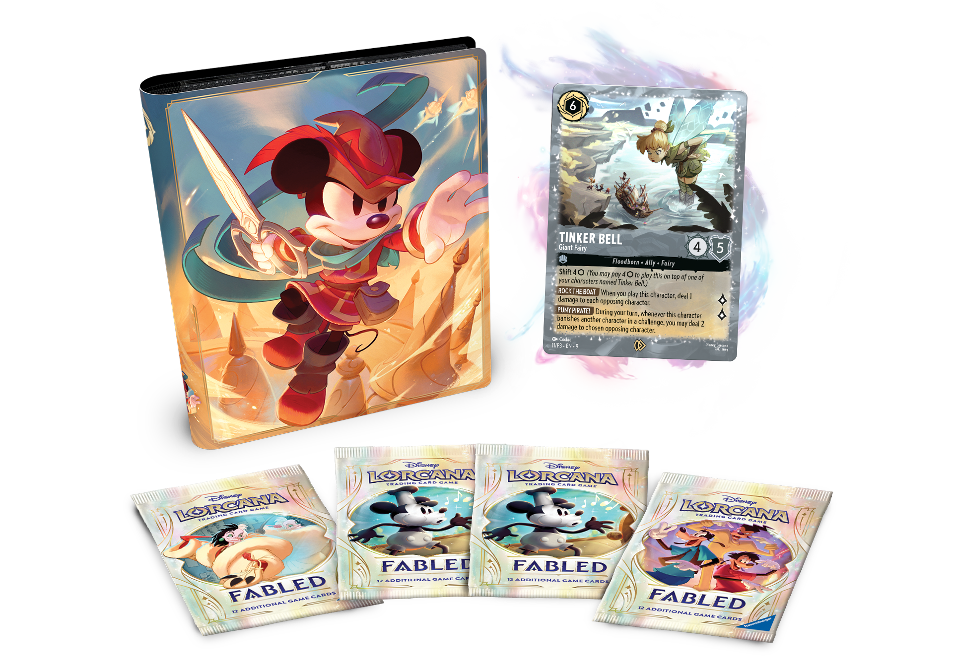 Collection Starter Set je další novinkou, kterou nám FABLED přináší. To potěší především všechny sběratele, kteří si chtějí své poklady v podobě vzácných karet umístit do alba a ochránit je tak před nechtěným poničením. V tomto sběratelském setu se můžete těšit na promo kartu Zvonilky, 4 boostery (balíčky) s 12 náhodnými kartami a album s motivem Mickey Mouse coby mušketýra, do kterého můžete bezpečně uložit až 80 svých sběratelských skvostů.