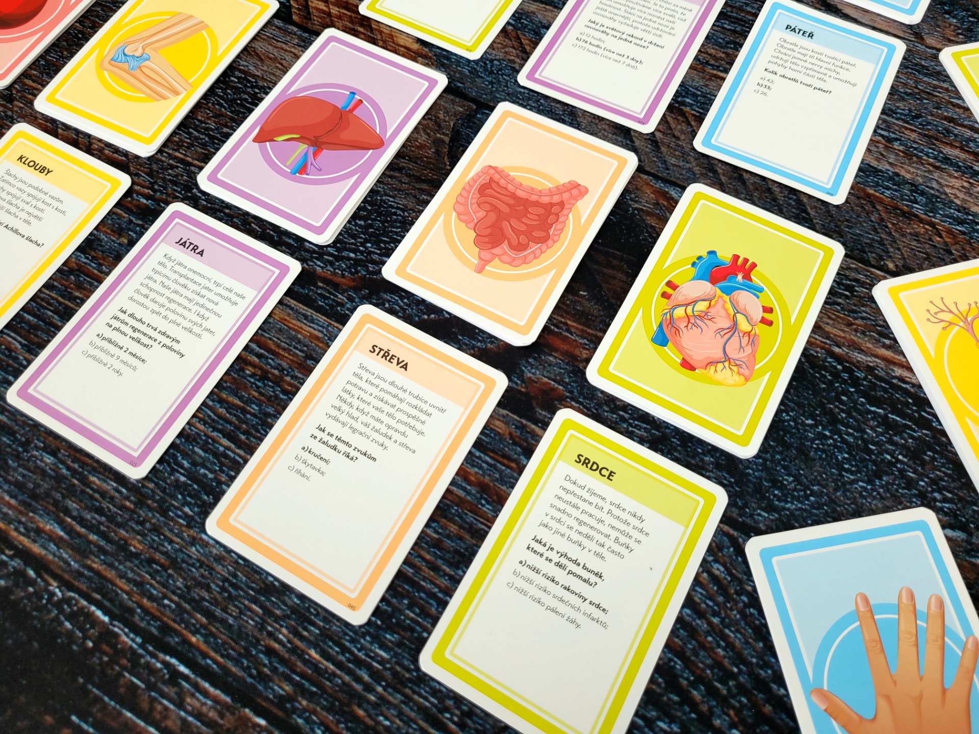 Ve hře jsou pravidla pro dvě různé varianty hry. Jedna je jednodušší, tou bych doporučila začít. V první variantě budete hrát pouze s kartami, na kterých jsou otázky a pohybové úkoly. Poté, co si osvěžíte a prohloubíte své znalosti, můžete přejít na druhou variantu, která je o něco málo těžší a budete v ní používat hledací karty s lupou, kterou budete označovat, kde se hledaný orgán nebo část těla nachází.