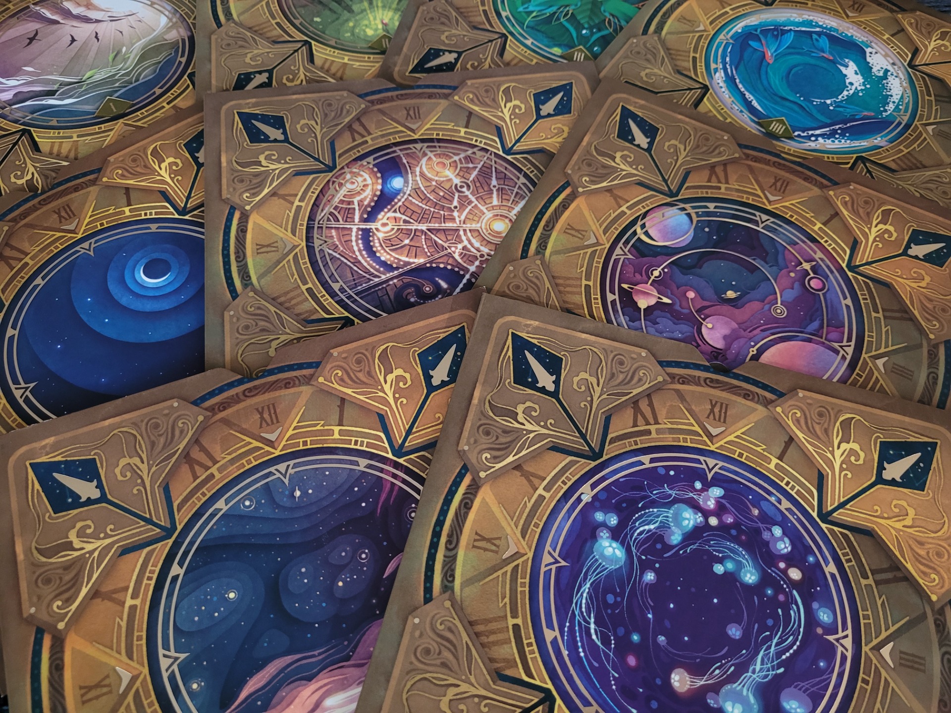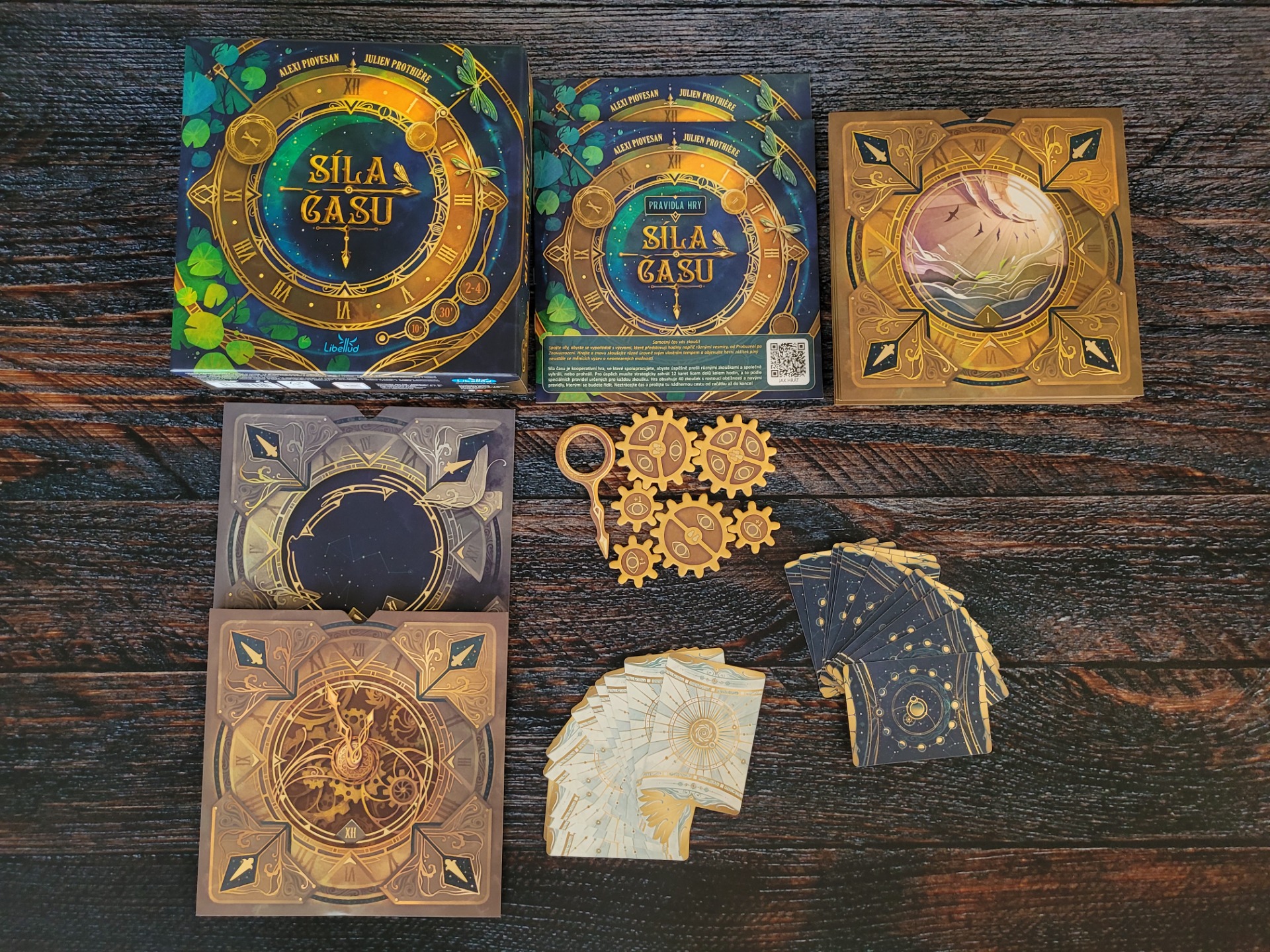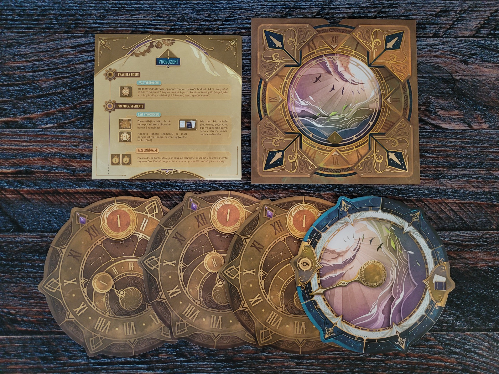 A co se týče grafického ztvárnění a kvality komponent, tak ta je jedním slovem úžasná! Karty jsou nádherné, ta zlatá barva a celkově jejich ztvárnění působí luxusním dojmem. Hodiny jsou překrásné, každé jsou jiné – nápadité a obálky jsou také krásně propracované.