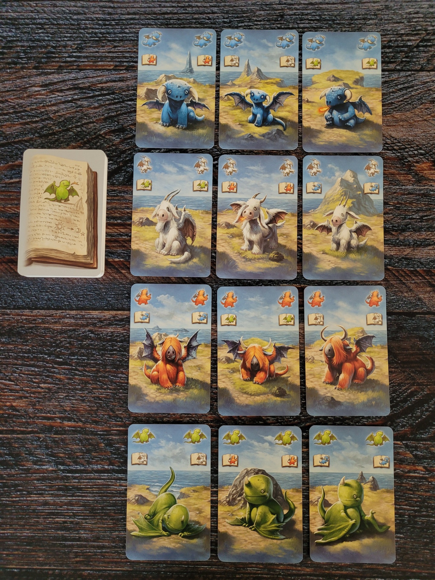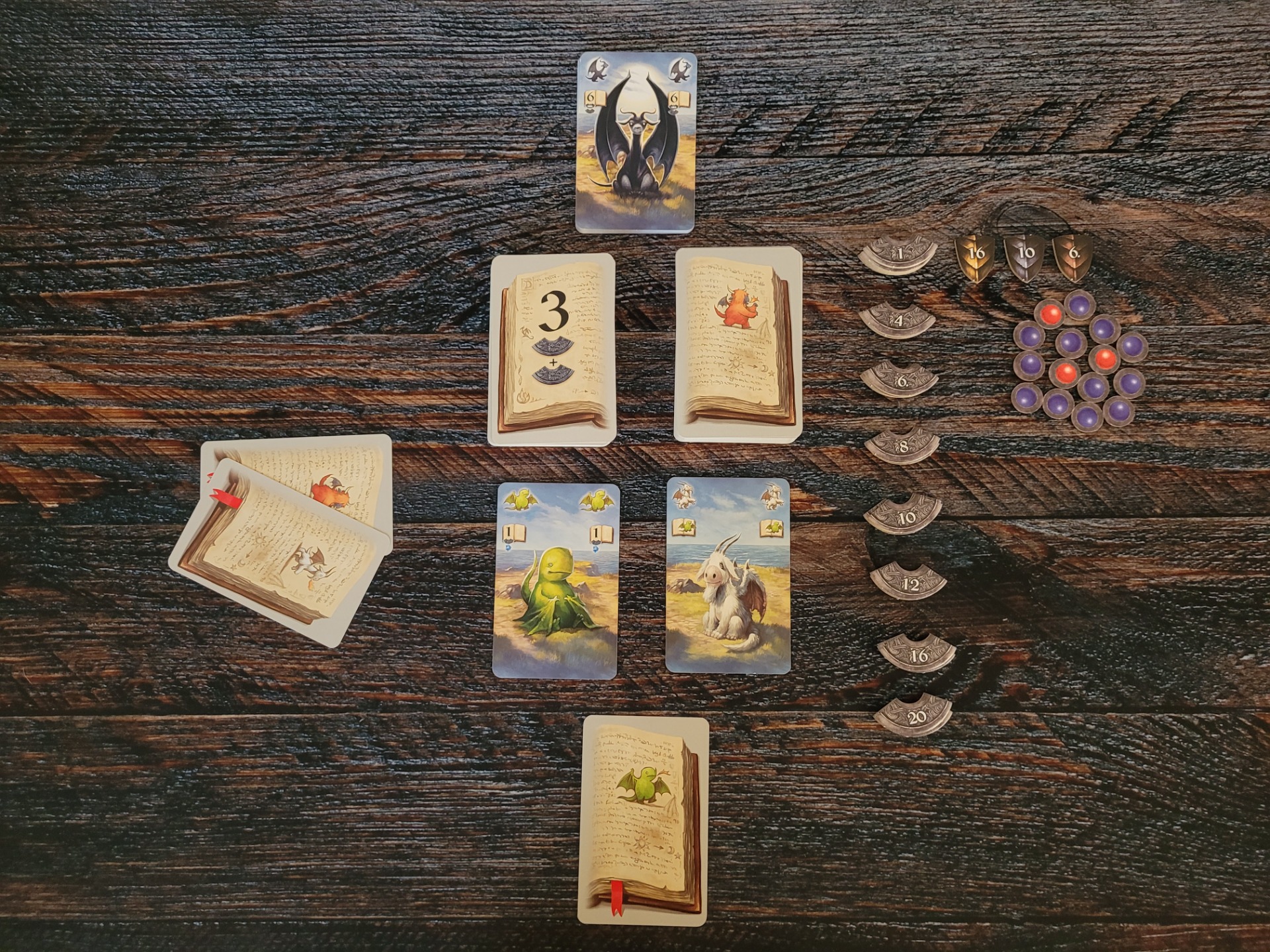 Zbylé karty se rozdělí dle jejich rubů na dvě hromádky (strany kouzelné knihy). Na levé straně budou pouze karty s čísly, na pravé straně karty s malými barevnými draky.