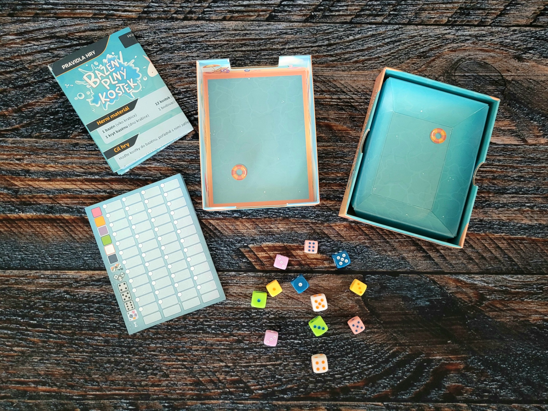 Všechny kostky se dají do bazénu a vedle se položí víko krabice. Každý hráč si vezme tužku a bodovací list.