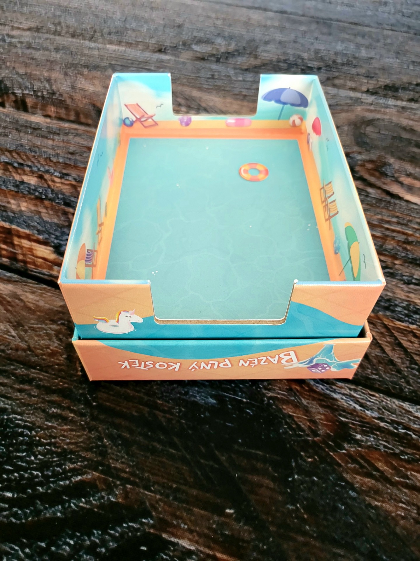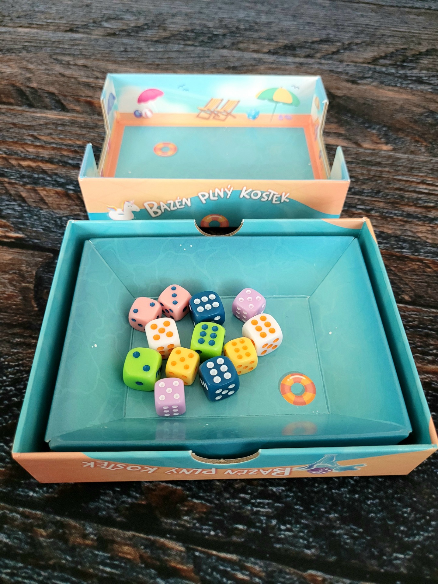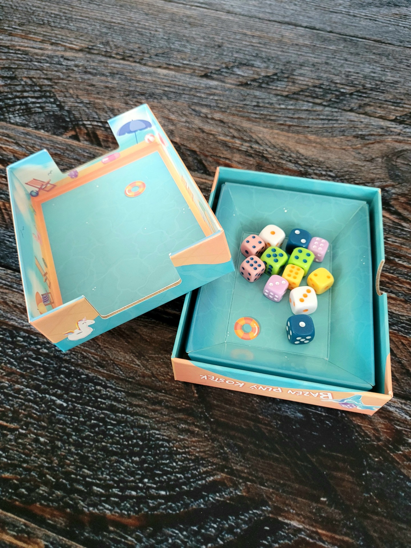 K samotnému hraní budete používat i krabičku, která představuje bazén. Po odkrytí víka krabičky uvidíte, že její vnitřek je opravdu udělán jako bazén, který má zkosené strany, aby v něm kostky dobře držely. K umocnění vodní zábavy jsou uvnitř krabičky ilustrace s letní tématikou v podobě plážových slunečníků, lehátek a písku.